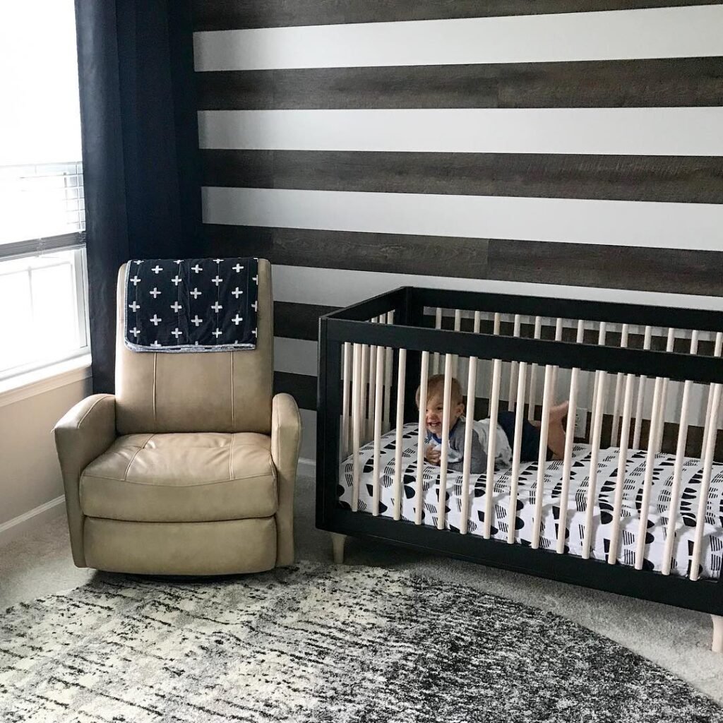This nursery gives a strong and modern look through its smart use of black, white, and natural wood colors. The main wall behind the crib really stands out with its wide flat stripes that switch between clean white and rich, dark wood. This lively pattern makes an exciting yet classy background that right away shows the room’s style. The crib itself looks great with its dark frame that contrasts nicely with the lighter wooden bars, giving it a fresh and special look. The bedding continues the black and white theme with fun abstract patterns, adding visual interest right where the baby sleeps.
