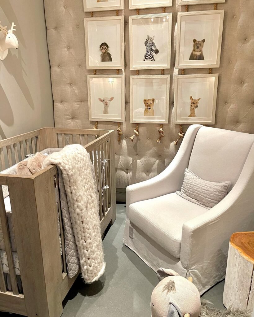 This calming space gives off a calm and classy feeling with its lovely neutral color palette and gentle safari theme. The walls are a special feature, covered in soft, puffy fabric that adds amazing texture and a plush feel to the space, making a cozy hideaway. Above the crib, a grid of framed animal portraits including a monkey, zebra, bear, lamb, lion, and maybe a fennec fox, brings personality and a sweet learning touch. Each print is simple and cute, shown in a white frame with natural rope details that fits with the overall natural and quiet look.