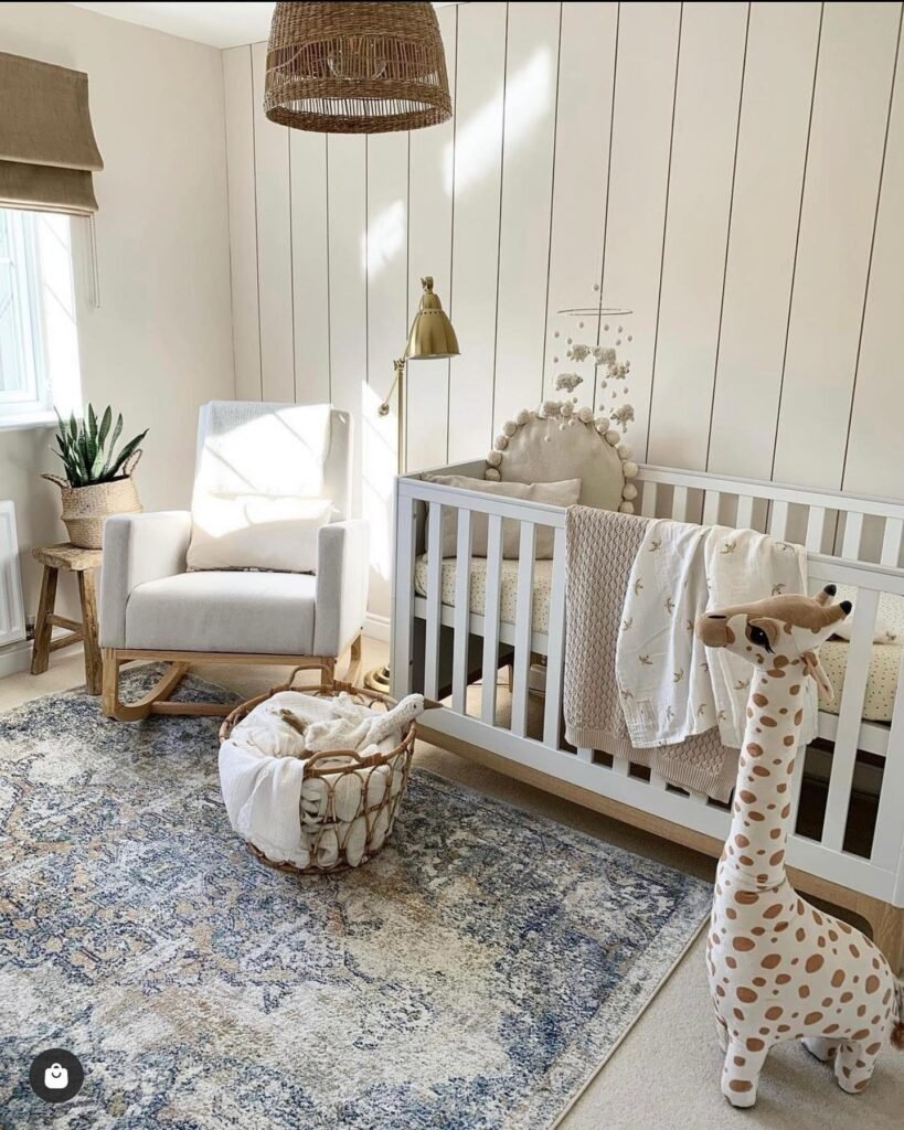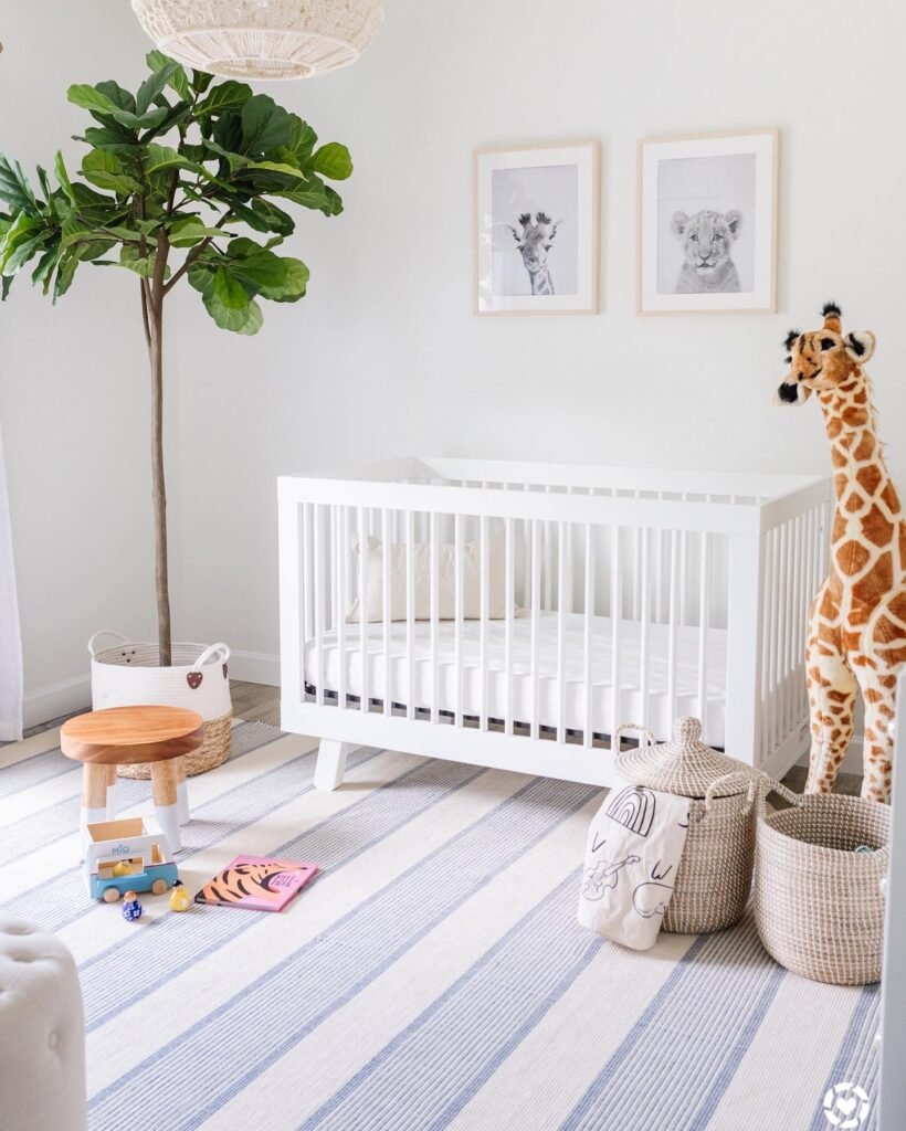 On the other side of the crib, a plush stuffed giraffe stands tall seriously cute and gives the room a playful feel. Near the crib, there are some woven baskets for toys or blankets, and a tiny wooden stool holds a toy car and a book. Simple, cozy, and ready for baby.