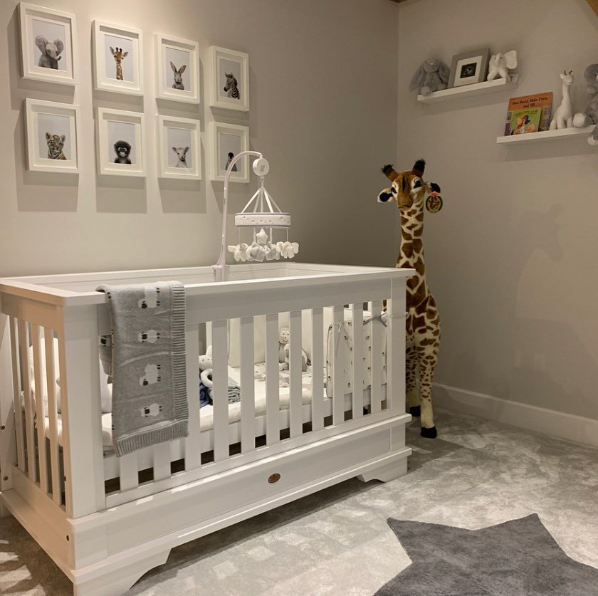 The walls are painted in light, neutral grey, giving a peaceful background for the lovely gallery wall. This wall has multiple white-framed prints of baby animals like elephants, giraffes, bunnies, and more, arranged in a neat grid. These cute portraits bring a playful yet nice touch to the room, sparking wonder. The white frames look beautiful against the grey, making the artwork stand out. The whole arrangement feels balanced and carefully picked, adding great character without being too much for the space.