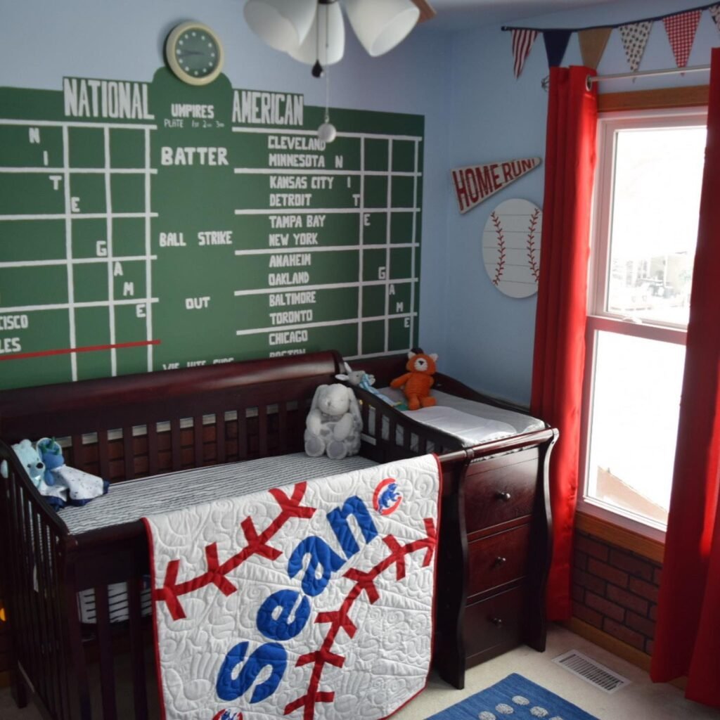This playful room is perfect for any little sports fan with its fun baseball theme taking center stage. The walls are painted a happy light blue, making a bright and welcoming feeling. Taking up one wall is a cool chalkboard-style picture that looks like a baseball scoreboard with team names and game numbers. This creative feature adds a lively and personal touch, and maybe even hints at the baby’s future interests. A classic round wall clock that looks like a stadium clock hangs above the scoreboard, making the theme even better. The dark wooden crib and changing table combo gives a nice contrast to the lighter walls.