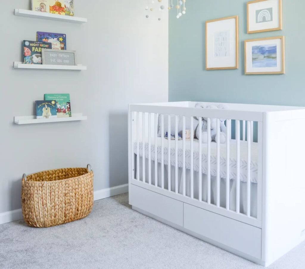 On the grey wall, three white shelves hold children’s books, making them look like decorations too. This keeps favorite books close by and makes the room feel personal. A small sign on one shelf says “BABY FRITSCH DUE SUMMER 2021,” which is a sweet touch. On the floor, a big woven basket holds toys or blankets. The soft grey carpet makes the whole room feel comfortable and cozy.