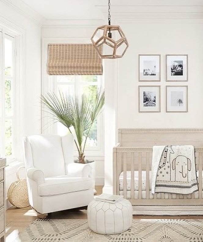 The crib in light wood keeps the soft and welcoming look, and has white bedding. Hanging over the side is a cute blanket with a simple elephant drawing, adding a gentle animal touch without being too much for the calm design. Above the crib, four framed black and white pictures of landscapes, likely showing palm trees or beach scenes, bring a classy touch and hint of travel dreams. These art pieces with natural wood frames tie into the room’s earthy and calm feel.