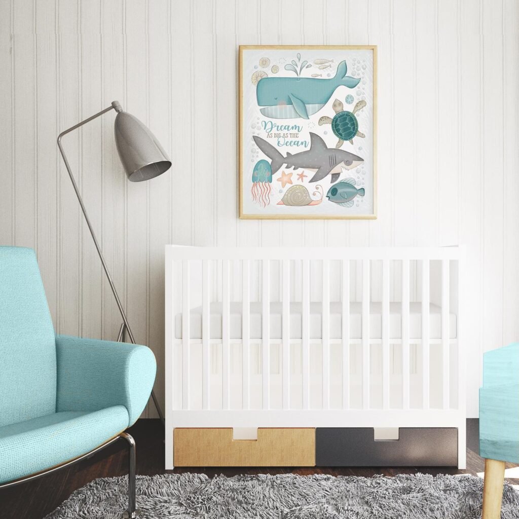 The biggest thing you notice is a big picture above the baby bed that says “Dream as big as the ocean.” It shows happy sea animals swimming around – there’s a big whale, a slow turtle, a friendly shark, plus lots of colorful fish and floating jellyfish. All the animals are painted in pretty blue and green colors that make you think of the beach. The wooden frame around the picture looks really nice with the wood drawer below.