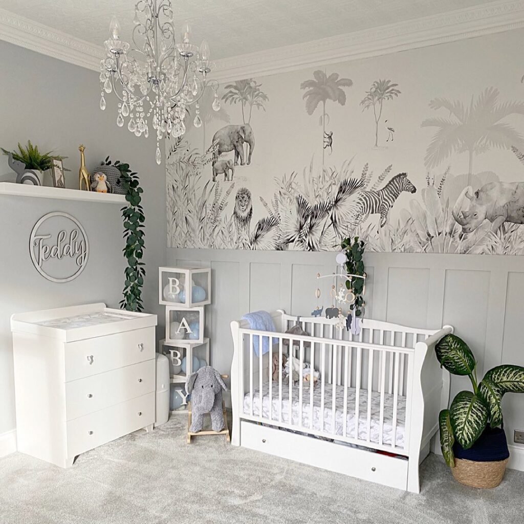 This adorable nursery takes the safari theme to a whole new level with its smart grey and white design. The back wall shows a beautiful jungle mural with elephants, lions, zebras, and green plants – all painted in soft grey and white colors. This wall art becomes the main focus of the room without being too bright or busy. The grey wainscoting below the mural adds a nice touch and makes the room look more finished and classic.