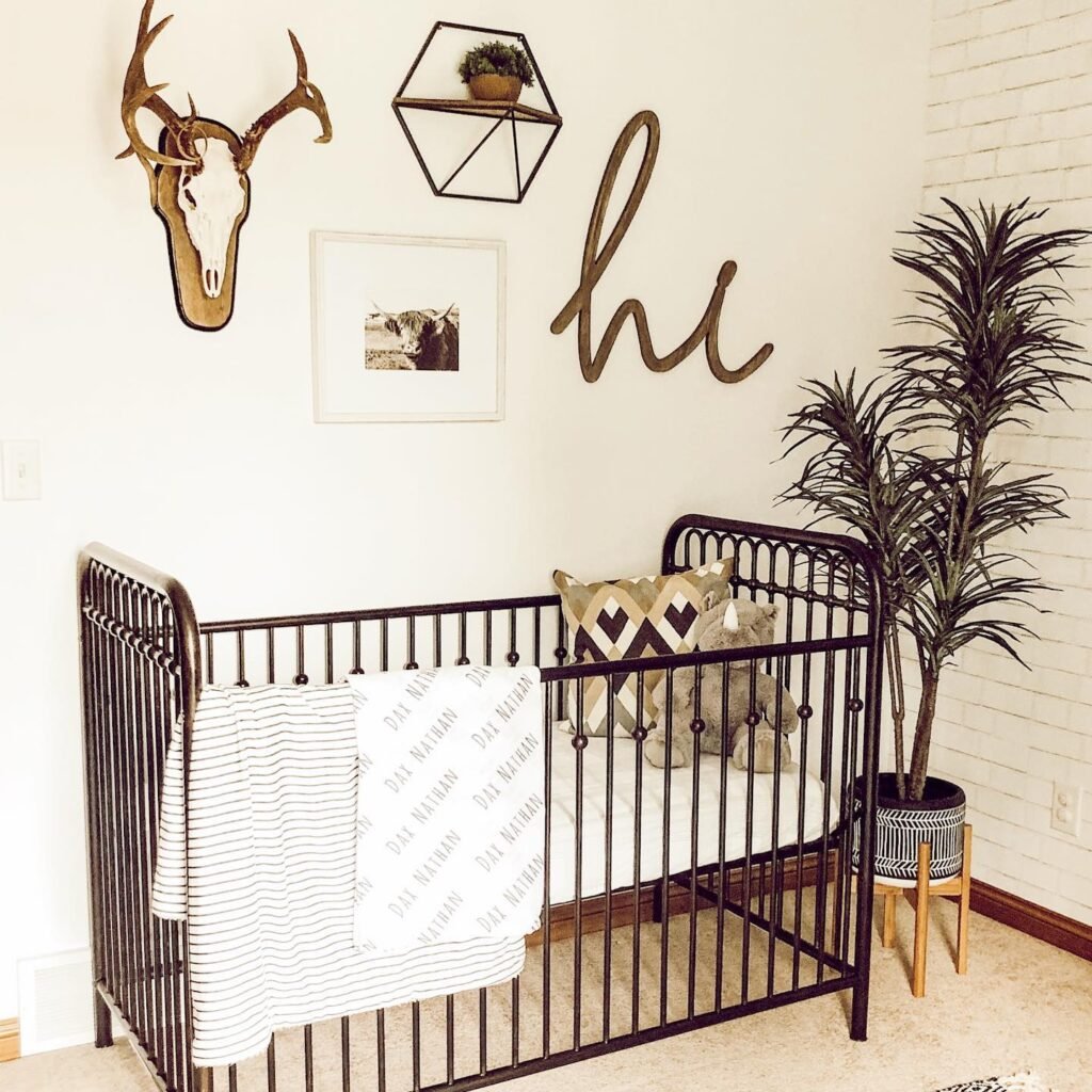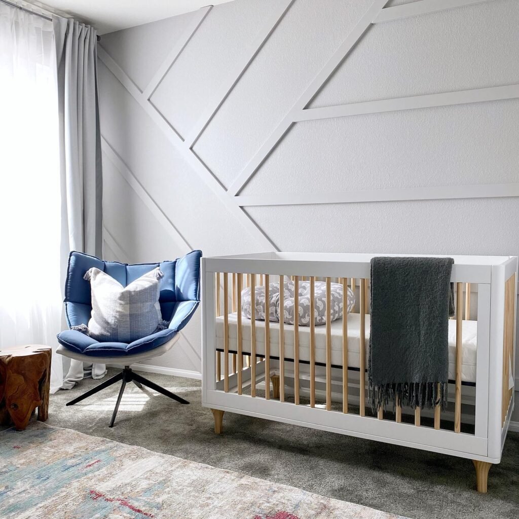 This nursery has a super fresh, artsy vibe. Behind the crib, the white wall is covered in cool geometric wood panels that make a big statement. The pattern gives the wall texture and movement. Simple but super eye-catching. The mid-century crib has a white frame with natural wood legs and cute wooden spindles. A soft dark grey blanket sits on one side for a cozy little detail.