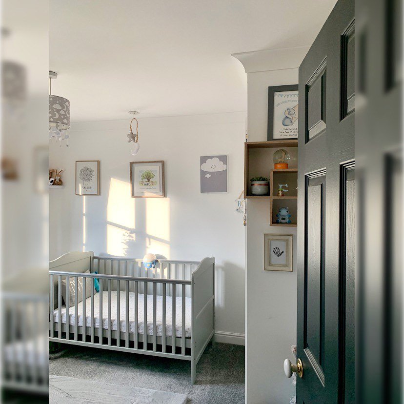 The wooden shelves built into the wall are super handy. You can put baby’s toys, books, and cute stuff on them. Your little guy will love looking at all his things as he gets bigger. The wood looks warm next to all the gray furniture. Those little pictures on the wall make the room feel special and personal.