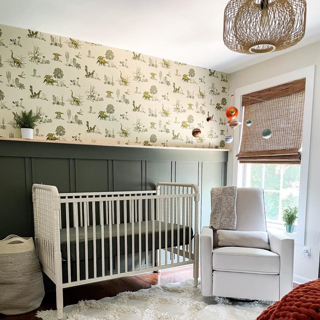 This dreamy setup has really cool dinosaur wallpaper, and it’s something most little boys would love. The dinosaurs are drawn in soft green shades on a light background, so they look cute and not scary at all. Under the wallpaper, there’s a green wood-panel wall that makes the room feel warm and cozy. The white crib really stands out in front of the darker green wall, and it all looks great together.