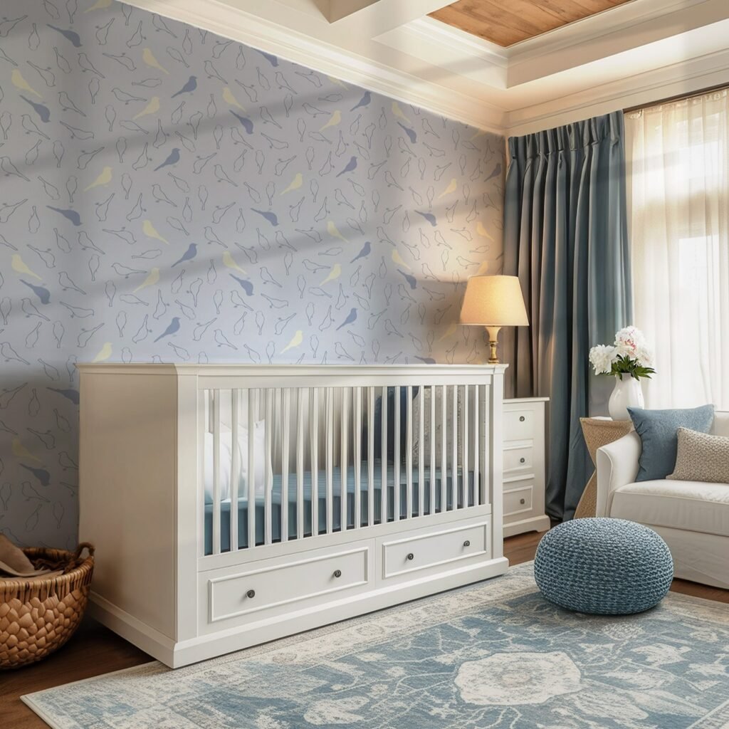 This sweet space is just peaceful. That bird wallpaper is so calm and sweet little bird shapes in soft blues and yellows on a light blue wall. It gives nature vibes but in a simple way, not too busy. The white crib looks clean and has two drawers underneath. Handy for keeping stuff out of sight. Inside? Soft white bedding and a light blue sheet to match.