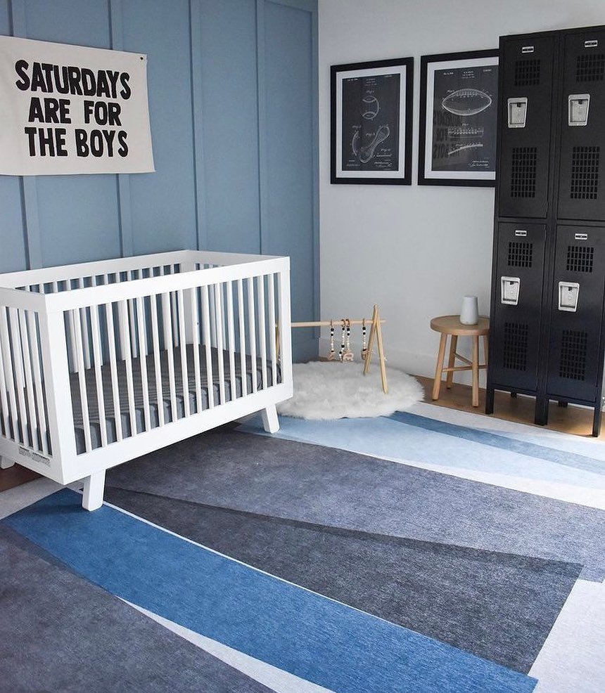 This little retreat has such a cool energy. The walls are painted a bold but calming blue, setting the tone for a fresh, sporty vibe. Behind the crib, there’s a board and batten wall that gives the room some texture and a modern touch. Above the crib, there’s a fun banner that says, “SATURDAYS ARE FOR THE BOYS” it adds personality right away. The white crib with light wood legs really pops against the blue.