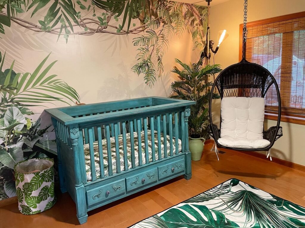 This nursery setup feels like a fun tropical jungle getaway. The walls are covered with a huge leafy mural filled with green vines and big tropical leaves. There’s even a sneaky little monkey hiding in the design. It makes the room feel like a real jungle. The crib is painted in a deep teal or turquoise color, standing out in the best way. It has three drawers underneath, and the bedding inside has a cute green leaf pattern that ties it all together.