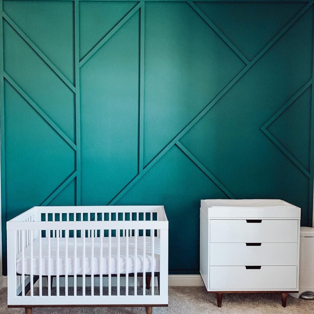 This stylish setup has a totally striking modern feel. The wall behind the crib is painted a deep emerald green that makes the whole room pop. On top of that, there’s a cool geometric wood design that adds shape and texture. It’s super clean but still fun. The wall feels like art. The simple white crib with wood legs looks great in front of it and adds a calm, fresh vibe.