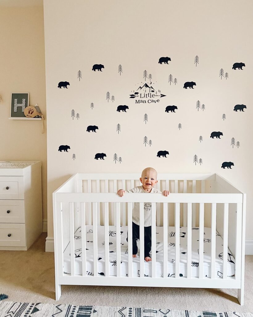 This nursery has a warm, playful woodland theme with a cool, modern twist. The main wall is painted a soft cream color, which makes the space feel bright and open. On top of that are fun black bear and pine tree decals, setting up a cute forest scene. In the middle, a small mountain shape and the words “Little Man Cave” bring in a fun, personal touch without making it too busy.
