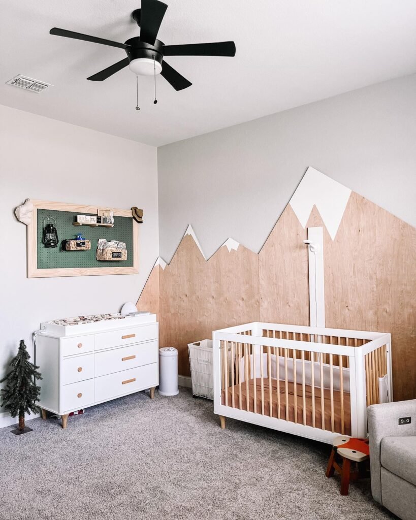 This nursery feels like a mini mountain getaway. The back wall’s painted with light grey up top, and underneath there’s wood paneling cut into peaks. It turns the wall into a little mountain scene. The white crib sits right in front with natural wood legs, and keeps things simple. Inside? Plain white sheets to stay clean and calming.