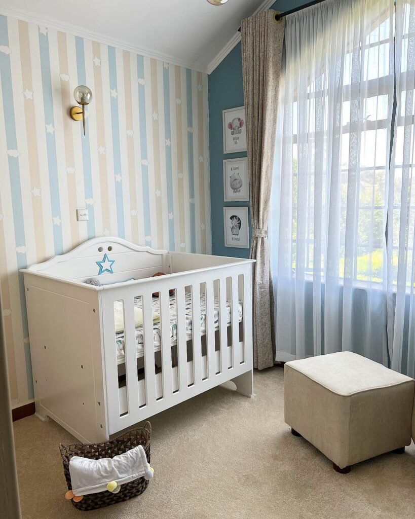 This nursery has such a calm and dreamy vibe. The wall behind the crib is covered in striped wallpaper with soft shades of blue, white, and cream. Mixed in are tiny clouds and stars, giving it a cozy, sky-like feel. The white crib sits right in front it’s simple and classic, with a little star detail on the headboard. The sheet inside is light blue, adding just a soft pop of color.