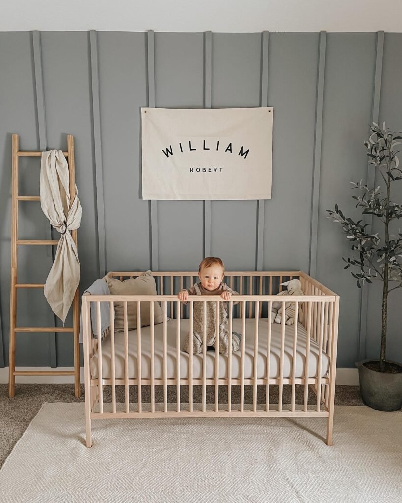 This nursery has a simple, clean vibe with a whole lot of calm. Behind the crib, the wall is painted a soft, muted grey, with tall vertical panels that add just a bit of texture. It’s modern but subtle. Up above, there’s a personalized fabric banner that says “William Robert” feels sweet and special without going overboard.