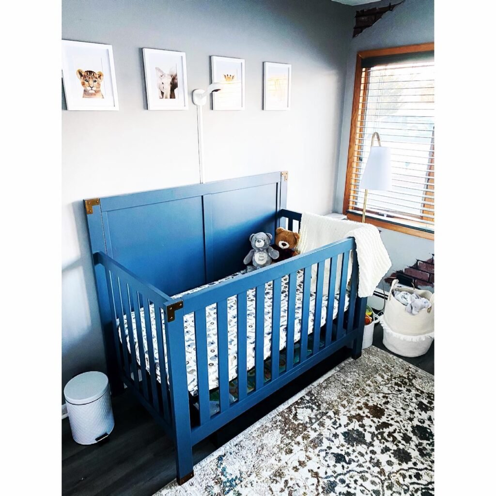 That one shows how a rich, deep blue can be both beautiful and relaxing for a baby boy’s room. The crib, painted in this lovely color, catches your eye right away and creates a peaceful feeling. Against a soft grey wall, the blue looks great without being too much, showing a smart use of colors. Above the crib, four framed animal prints with a lion and elephant add a fun touch and hint at a love for wildlife. These clean white frames look nice against the wall and make you notice the sweet pictures. The bedding has a gentle, soft pattern that goes well with the blue without fighting with it, making everything look good together.