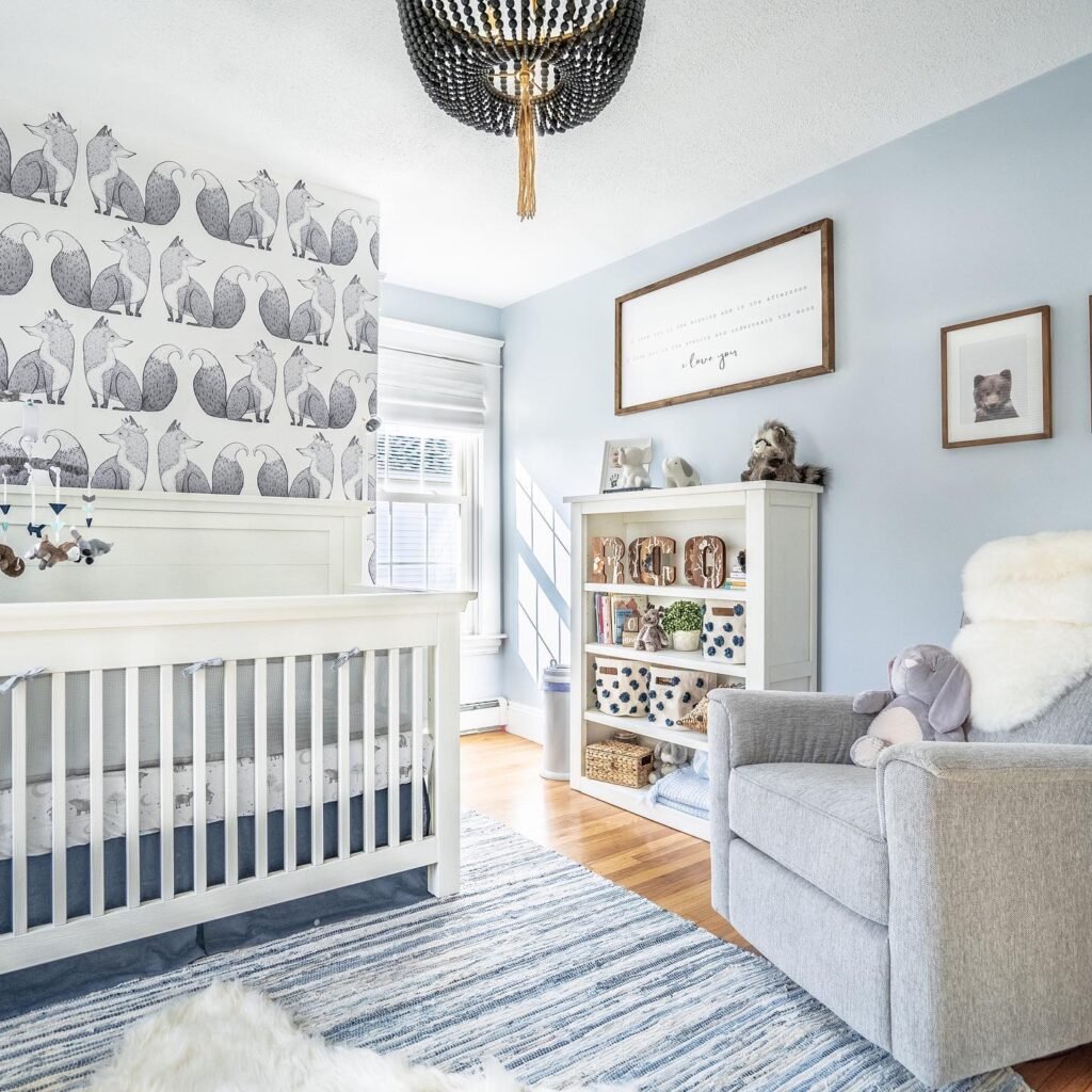 This room is all kinds of woodland cute. Right behind the crib, there’s this soft grey and white fox wallpaper. It adds just the right amount of fun without being too much. The white crib pops against it, simple but sweet. Hanging above, a soft little animal mobile moves gently perfect for keeping baby calm.