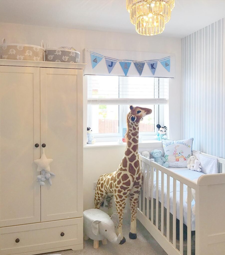 The window brings in lots of light with simple white blinds. Right above, there’s a little flag banner that spells out “J K” a fun nod to the baby’s initials. Next to the crib, a tall stuffed giraffe stands proud. A small elephant stool sits nearby. Cute and useful later on.