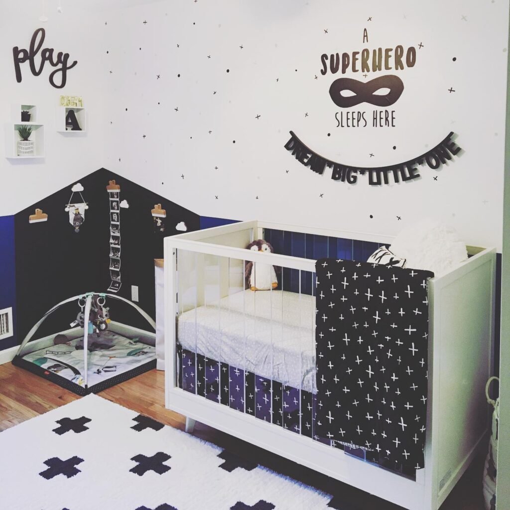 This nursery is a fun and exciting space made for a future superhero. It uses bold black and white colors with bright touches here and there. The walls are clean white, making a perfect background for the cool wall stickers. Above the crib, a big message says “A SUPERHERO SLEEPS HERE” with a mask picture that sets the whole mood. Under that, another phrase reads “DREAM BIG LITTLE ONE” in fancy letters that push kids to think big. Small plus signs and dots cover the white walls, making a simple pattern that looks fresh and lively.