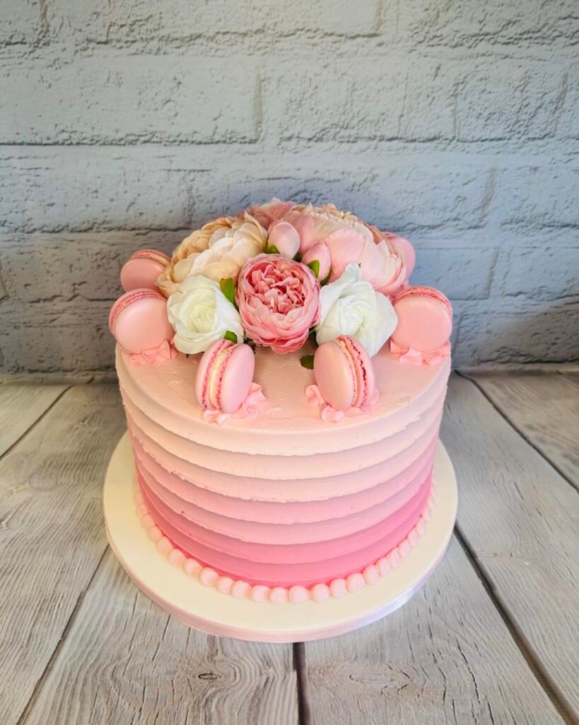 Can we just talk about how pretty this cake is? Like, it’s got main character energy sitting right there on that dessert table. Between the ombre pink buttercream and those big fluffy peonies on top it’s giving all the soft and fancy vibes.