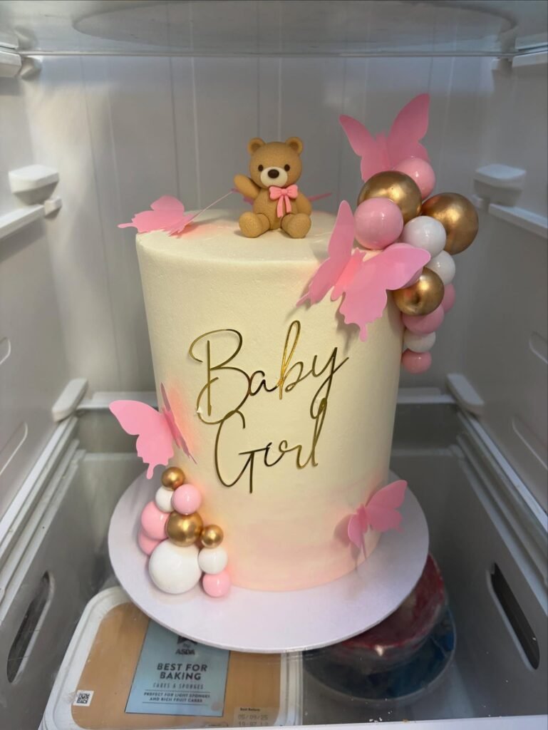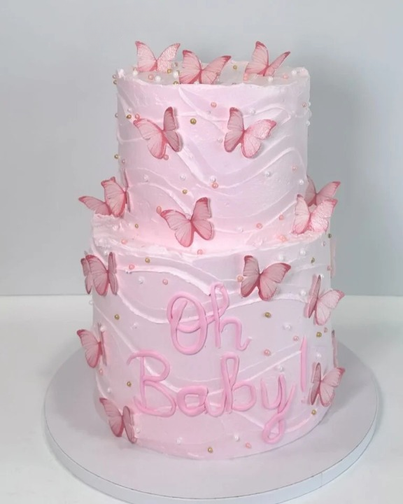 You ever walk into a party and immediately go, yep, that cake’s the one? This beauty has that effect. It’s pastel pink, covered with little edible butterflies, and has pearl sprinkles scattered across both tiers. Oh and the words “Oh Baby” in piping that actually looks handwritten.