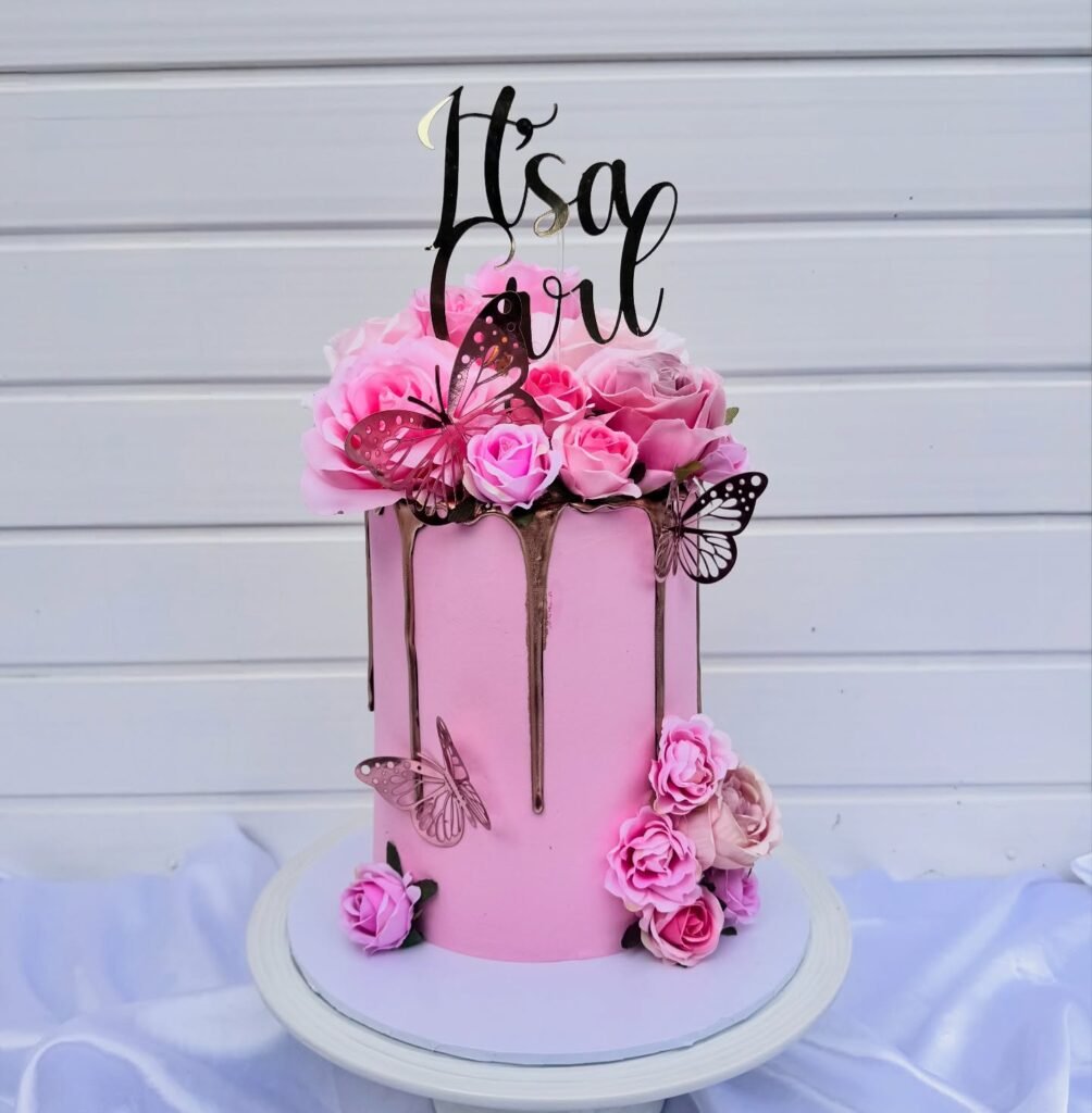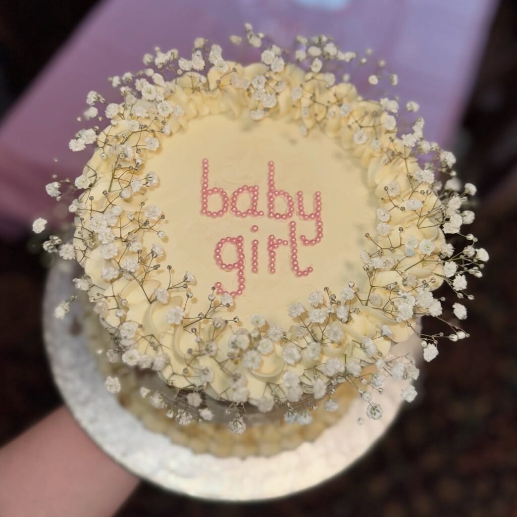 The “It’s a girl” plaque on the cake is bold and clear, but the overall look still feels soft. There’s just enough detail on this one to make a “wow” moment without overdoing it.
