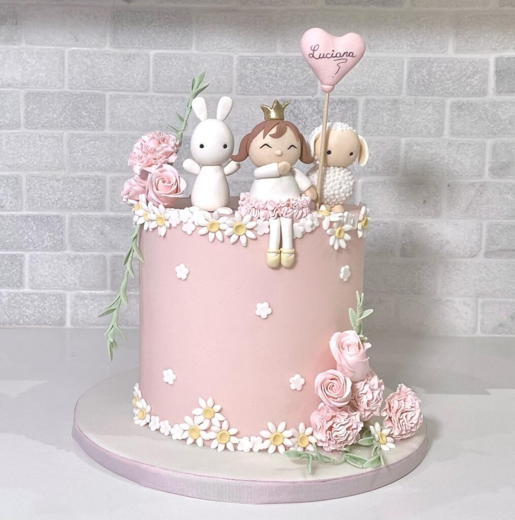 This cake nails the soft, storybook feel. Light pink base, daisy flowers scattered around, and those tiny roses? Total perfection. The pastel tones and cute little character toppers make it feel like you’re stepping into a picture book. And the floating heart balloon with the name? Such a precious personal touch.