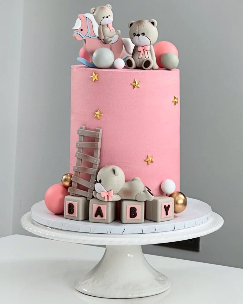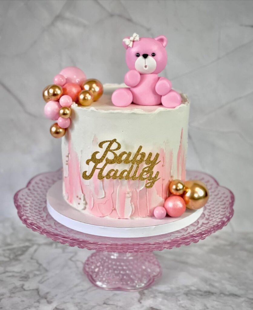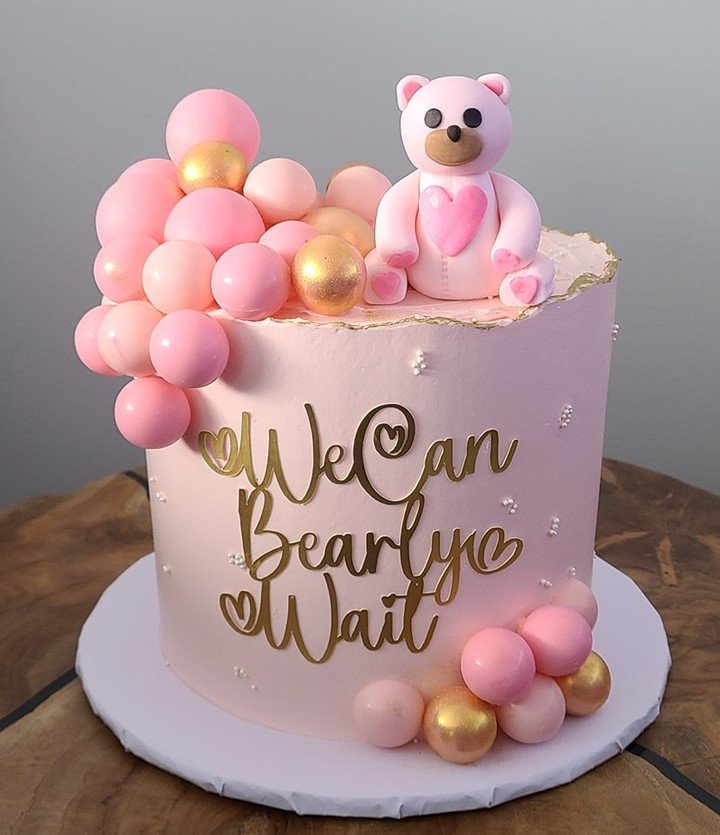 Would it even be a baby shower without a bear somewhere? This cake totally leans into it soft pink bear topper, gold bubble accents, and a fun, scraped-texture buttercream that gives it a cool handmade vibe.