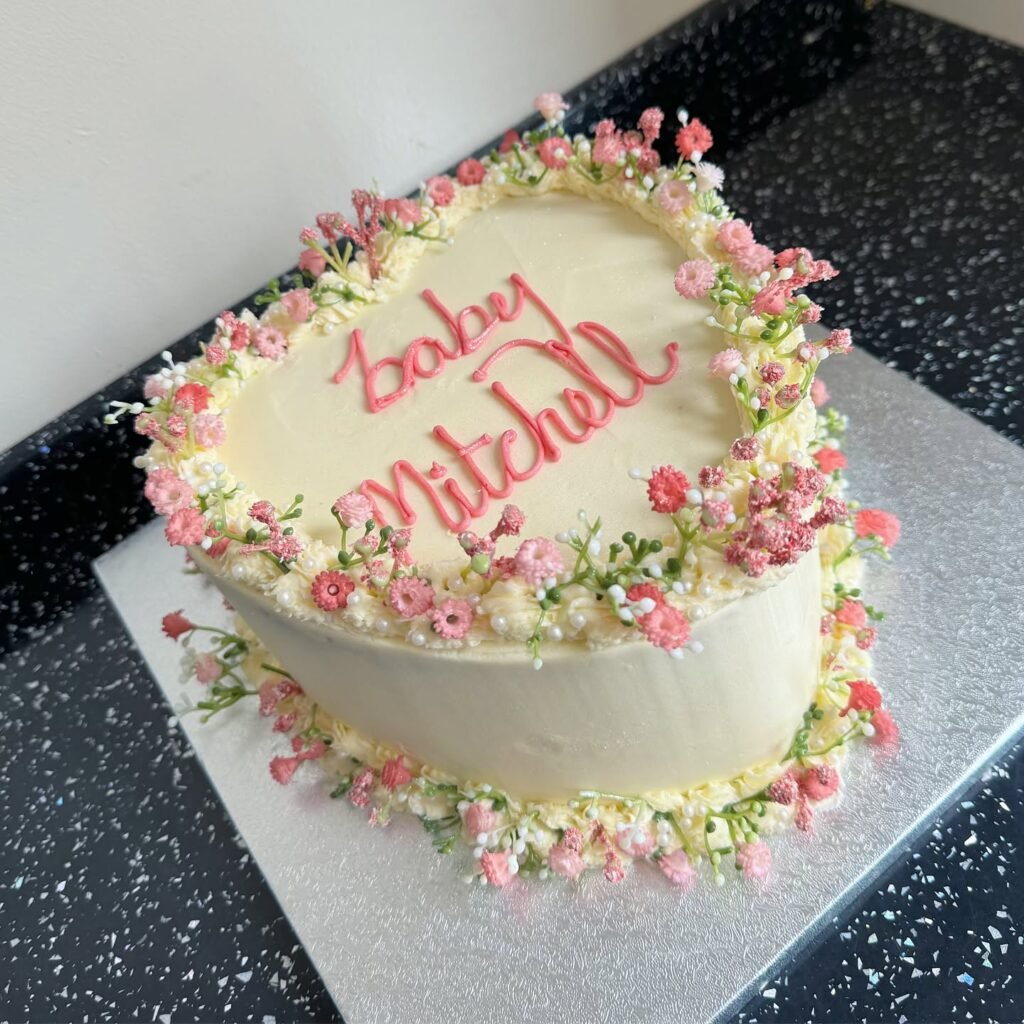 Kind of obsessed with the heart shape too? It’s not something you see every day at a baby shower, so it makes the whole setup feel a little more thoughtful. The fresh pink writing keeps it playful, but that floral edge? So detailed. Like, it actually looks like someone spent hours clipping tiny wildflowers and placing them around the whole thing.
