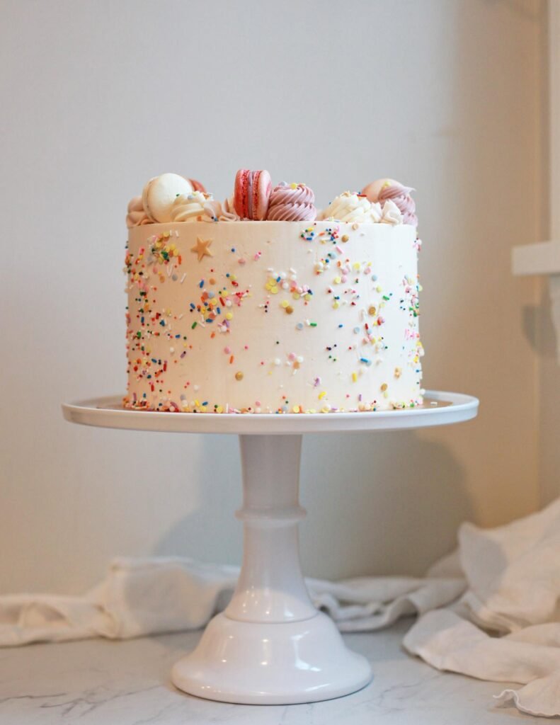 This one is just plain fun. Like, straight-up let’s-celebrate energy. It’s playful, colorful, and full of little surprises from the sprinkles all over to the swirls of frosting and the cute little macarons on top.