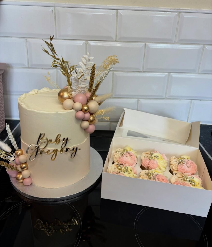 The pale frostings, those bubble-like accents in nude and blush, the dried florals it’s serving soft glam desert vibes. Plus, it comes with matching cupcakes. And honestly? That box of swirly pastel cupcakes makes the whole concept feel even more intentional.