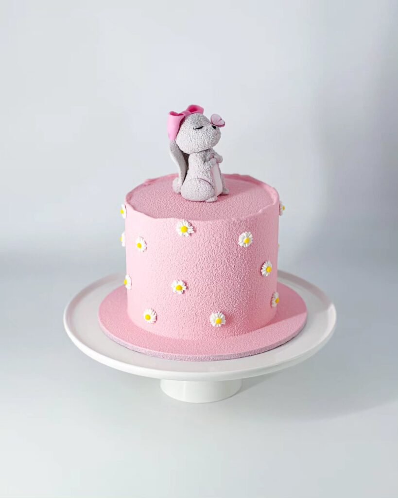 The texture on this cake is really different it’s got that velvety, almost fuzzy finish. Paired with the teeny daisy decorations spaced out evenly, it feels super minimal but still really stylized. Pink and simple will never go out of style when you do it like this.