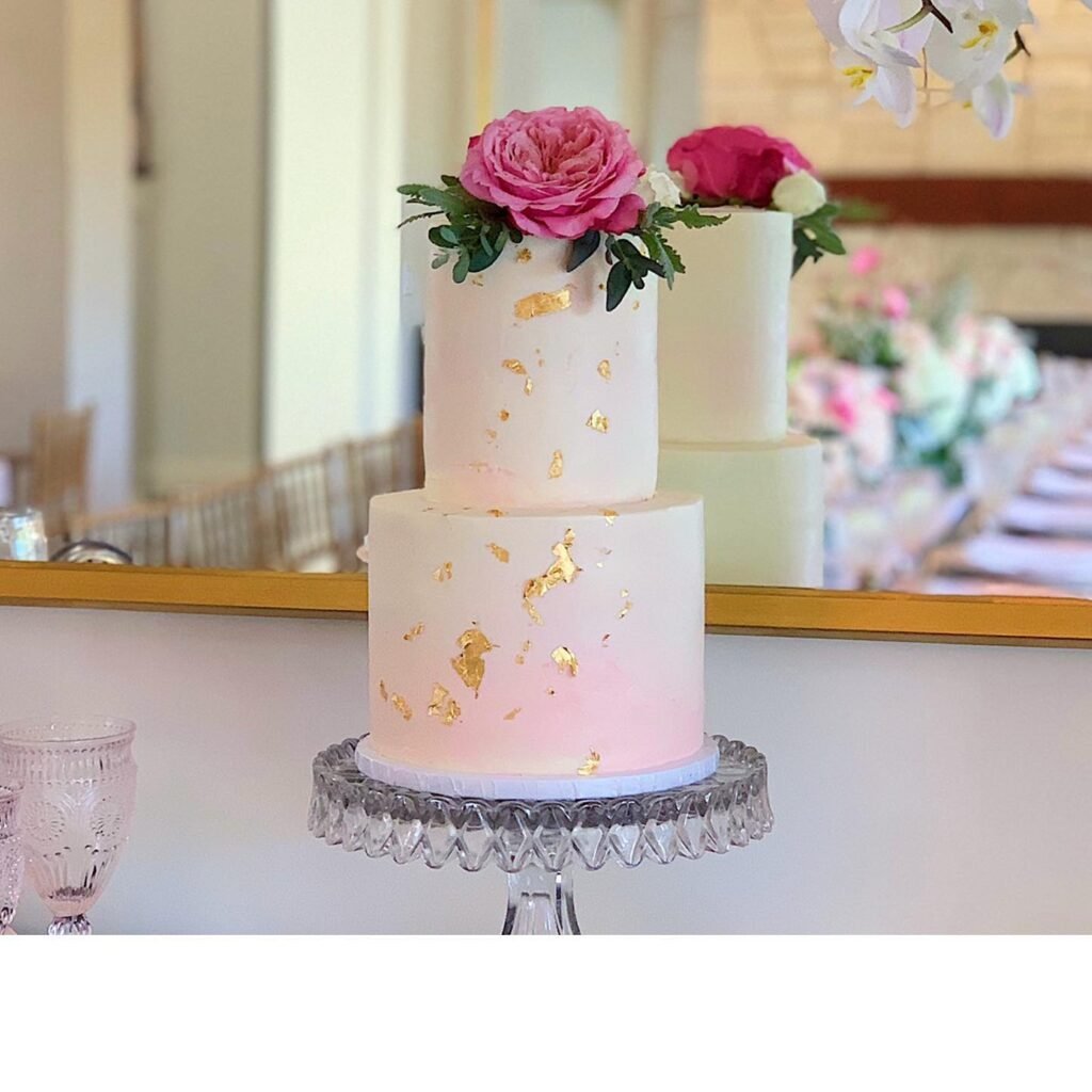 Looking to keep things super classy but still baby-shower-ready? This cake’s your answer. It’s two clean white tiers, lightly brushed with blush, topped with real flowers, and flecked all over with gold. Simple. Gorgeous. Done.