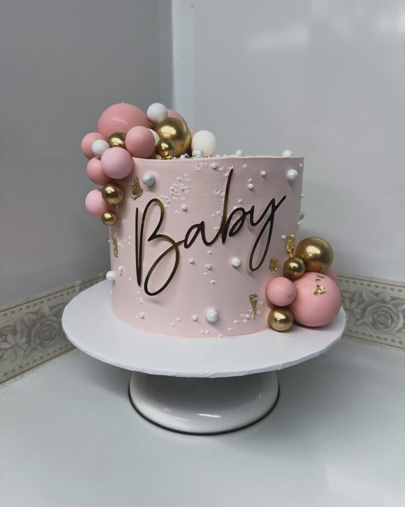 You ever see a cake that’s just… cool? This pink and gold beauty is totally that. Super clean frosting, bold “Baby” script, and those bubble clusters? Obsessed. It’s got a modern, arty feel without trying too hard.