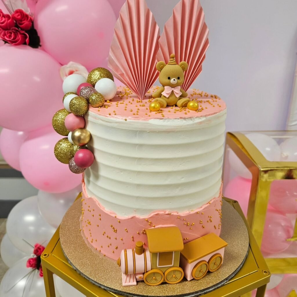 Is this a cake or a party on a cake? Because wow. You’ve got the glittery gold sprinkles, the candy bubble garland, the cute birthday bear topper, and a tiny fondant train cruising along the bottom. It’s doing a lot… but like, in a really fun way.