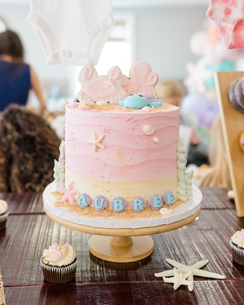 You ever want a cake that’s basically a little ocean adventure? This one’s got shells, starfish, sea creatures, and a whole summer-vibe color palette. Even the name “Aubree” is spelled out in cute beachy blocks at the base. So fun.