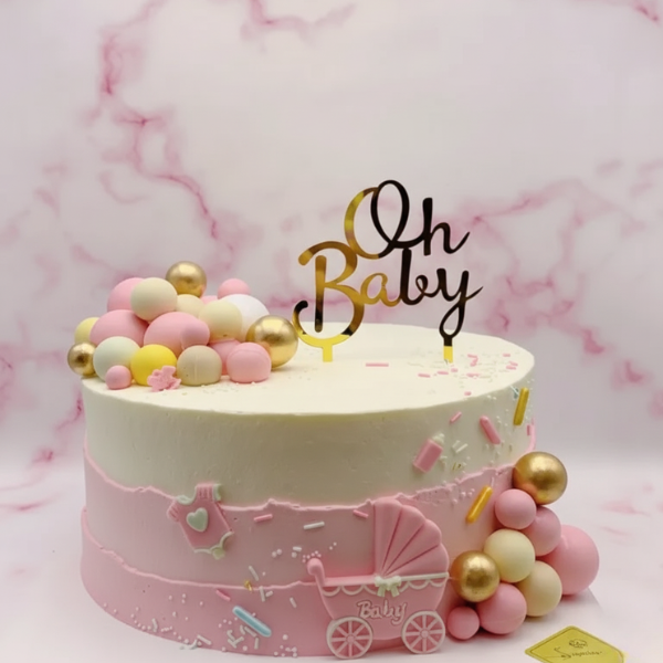 The gold “oh BABY” topper makes a bold first impression, but the rest of the cake is actually really chill and sweet. The top half is a soft cream, then down into a dreamy pink, almost like frosting dipped into blush. Super minimal texture, but the details really pop gold pearls, shiny globes, soft shimmer. Cute without trying too hard.