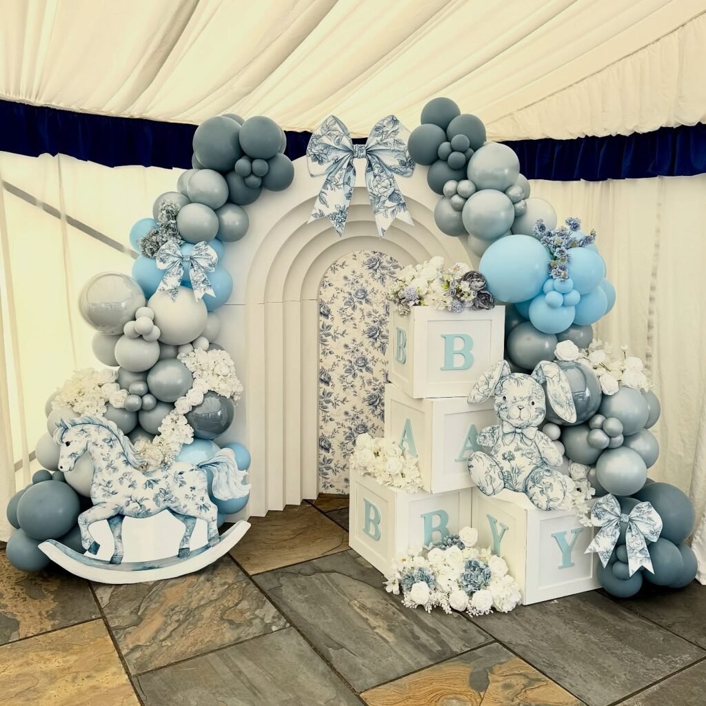 Who says baby boys can’t have stylish setups too? This blue-and-white setup is soft, cozy, and full of charm. From the printed rocking horse to the balloon arches and cute little bows, it feels like a sweet baby book come to life.