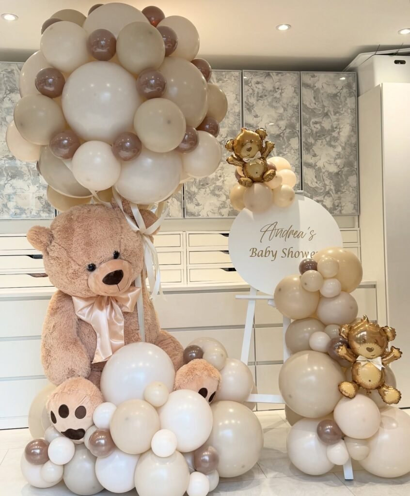 The balloon work is everything here. A big round bunch floats above the bear, almost like it’s being carried away. Smaller bears and satin bows finish the vibe and then you notice the tiny gold bear balloon tucked in with a cheeky smile. Can’t handle it.