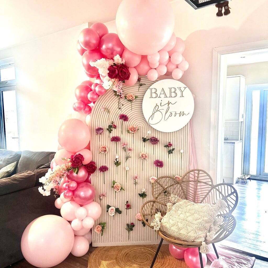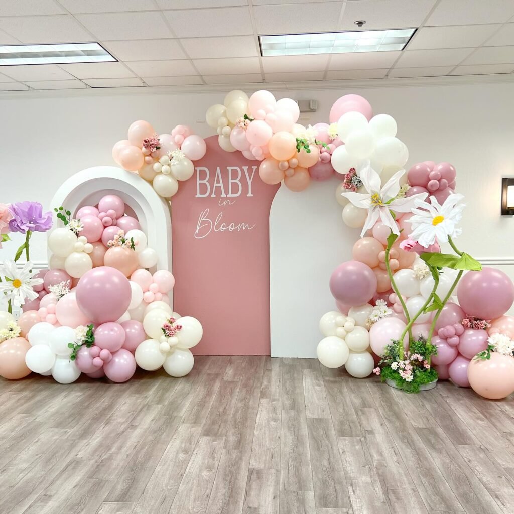 Can soft pinks and creams ever go out of style? Not with a setup like this. The “Baby in Bloom” sign says it all. Big pastel balloon bunches and soft shapes give everything a calm, happy feeling like a baby garden in full bloom.