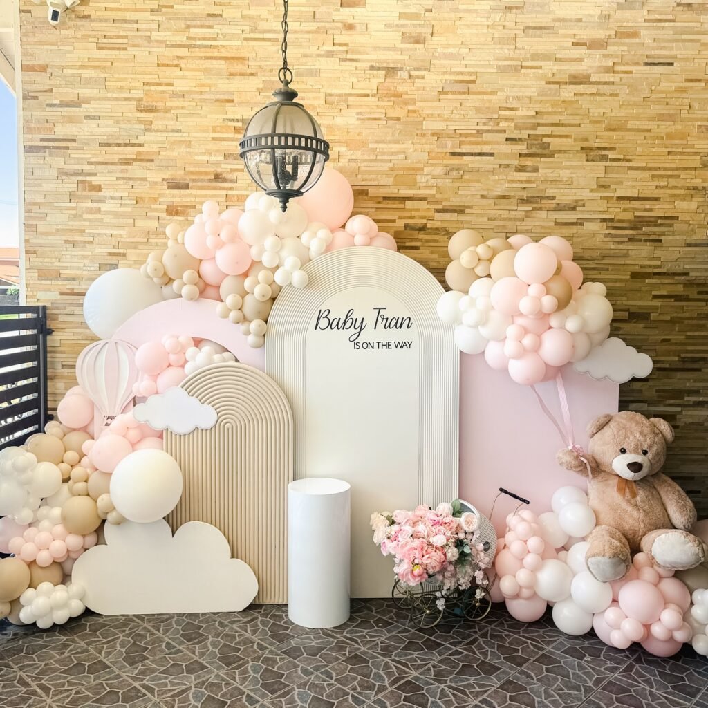 That “Baby Tran is on the Way” sign says it all. The setup is stacked with layers literal clouds of pastel balloons, lined textures, rounded cutouts. And tucked right into the corner? A big teddy holding balloon strings. It’s crisp, clean, and warm without trying too hard.
