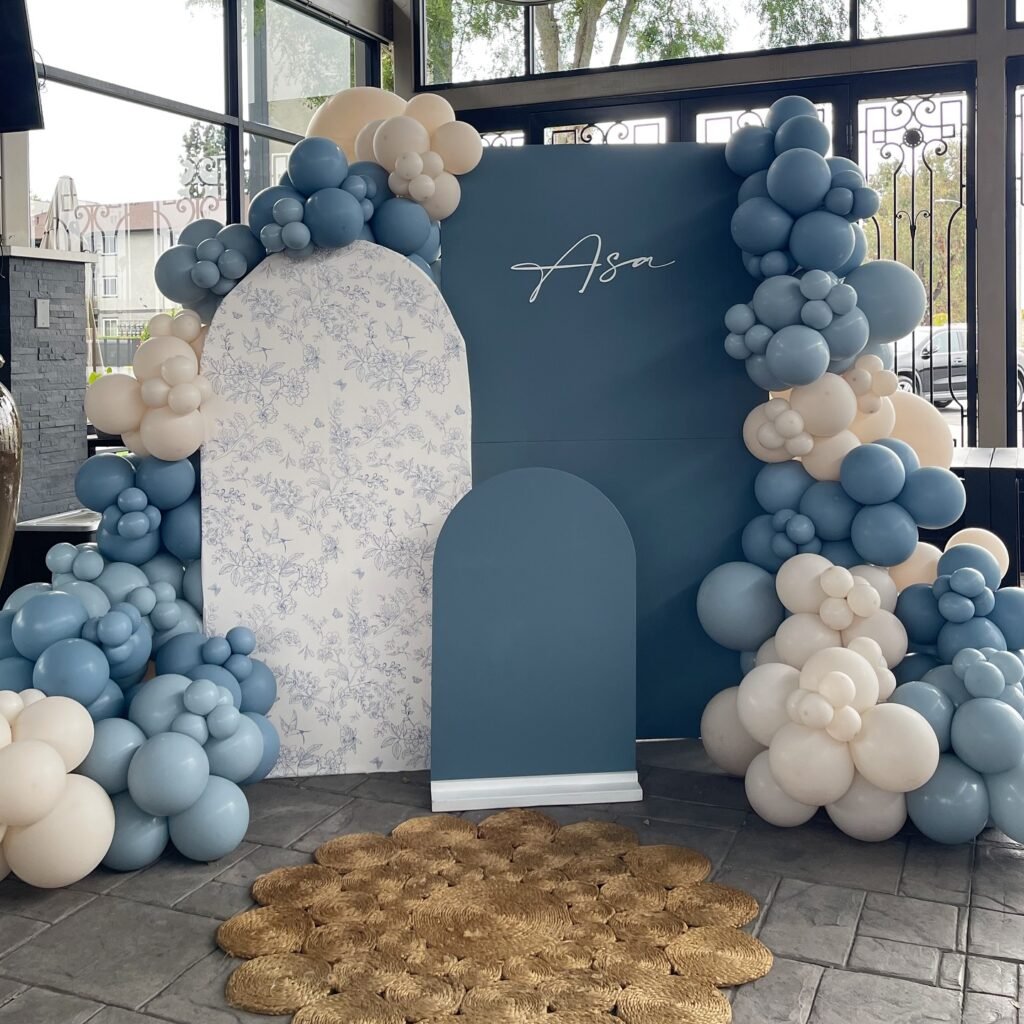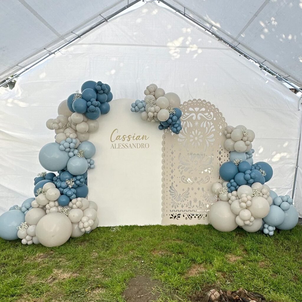 Why not keep it calm and keep it gorgeous? This elegant setup in dusty blue and soft beige is doing everything right. The big custom board has the baby’s name Cassian Alessandro front and center, while balloons spill around the sides like a gentle wave.