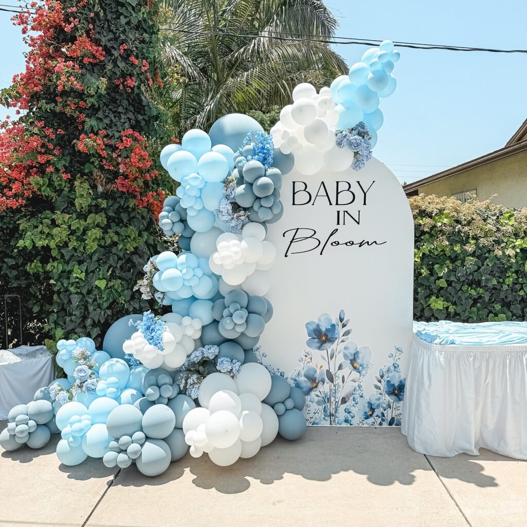Ever seen blues used this beautifully? This outdoor shower setup takes soft tones and turns them into something dreamy. You’ve got everything balloon bunches, florals, and a clean white backdrop with “Baby in Bloom” in the middle.