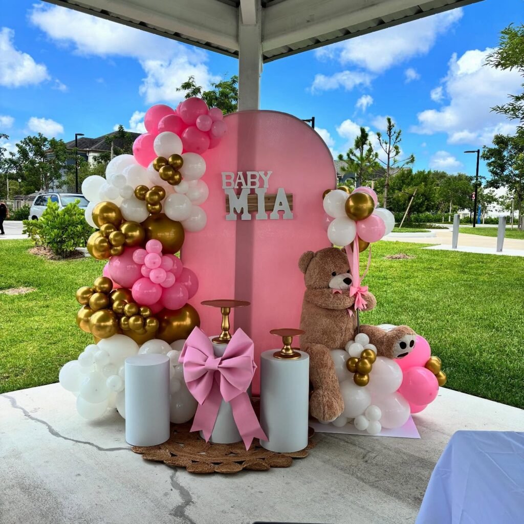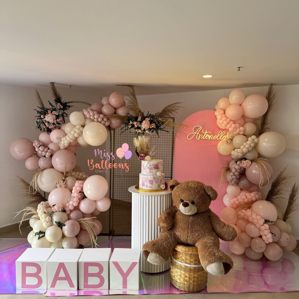 Does it get more classic than pink and gold for a baby girl? This setup for Baby Mia goes big with girly energy and still keeps it fresh. From the oversized teddy hugging balloons to the metallic gold pops, it’s playful and fun.