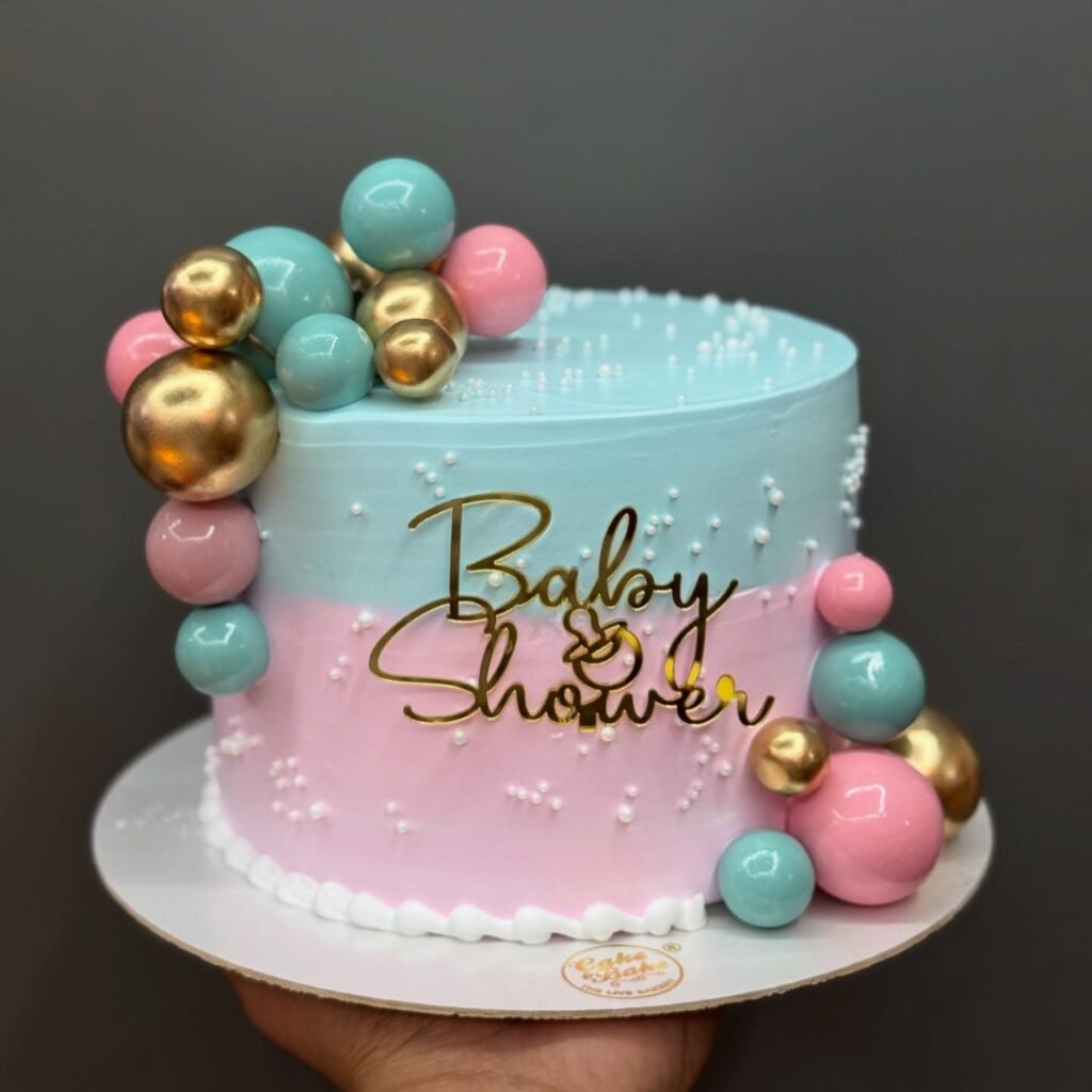 Gold, pink, and teal bubbles stacked on top add a fun, shiny twist. A few white sprinkles all around the sides bring in texture. The cake topper just says “Baby Shower” in gold simple and cute.