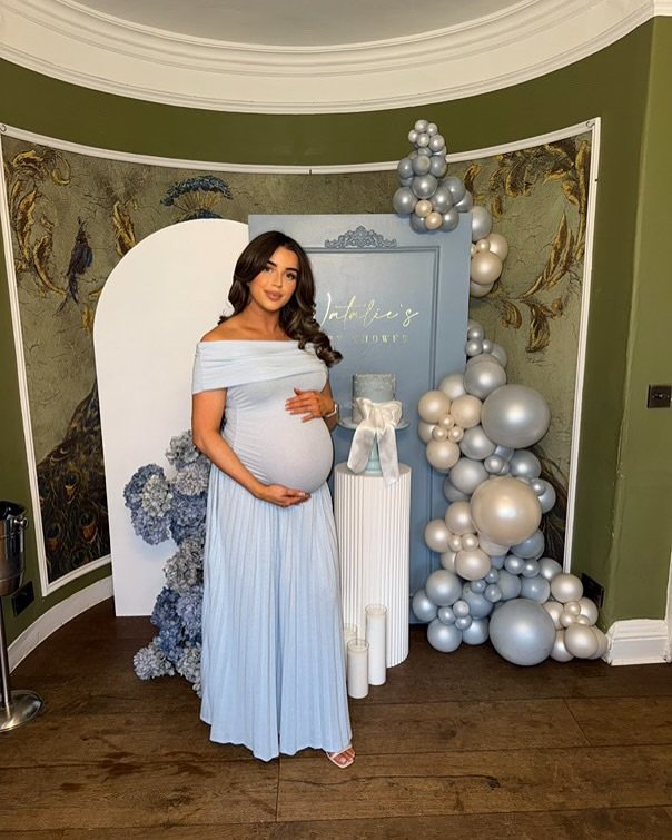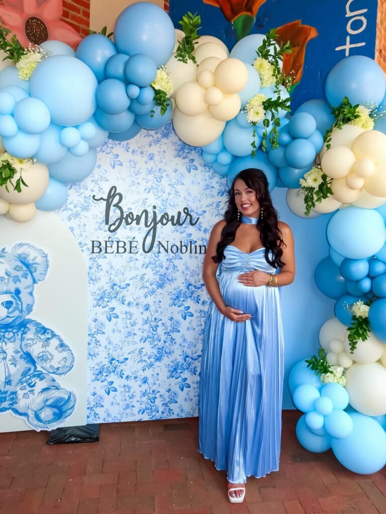Is it possible for a baby shower to feel like a boutique hotel? This one says yes and makes it look easy. Blue toile everywhere. Big balloon arches with soft greens tucked inside. And right in the center? The mama-to-be looking stunning in satin.