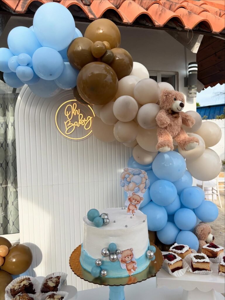 Need something small but still cute? This setup keeps it simple and cozy. A soft arch with a gold “Oh Baby” light sign, balloon bunches in soft blue and cream, and little teddy bears tucked in for cuteness.