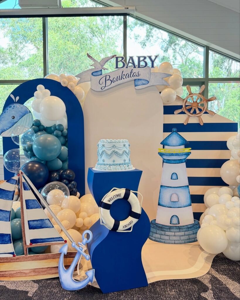 Ever thought of doing a baby shower with a sailboat theme? This nautical setup is totally different and totally fun. Anchors, lifebuoys, and even a lighthouse. All in bold navy and white with a splash of sky blue.