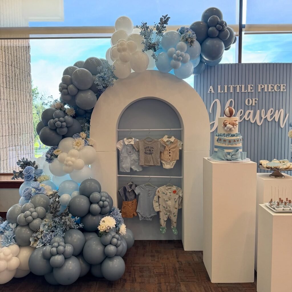 It’s ideal for stylish indoor celebrations. Crisp, photo-ready, and quiet on purpose. Great for a baby boy shower with a little polish.